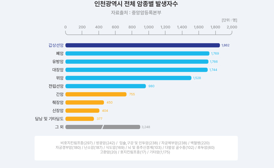 2024년 12월에 발표된 국가암등록사업연례보고서에 따르면 2022년 1월 1일부터 12월 31일까지 인천광역시 암 발생자 수는 282,047명으로 연령표준화 암 발생률은 인구 10만 명당 550.2명이었습니다. 남, 여 전체에서의 암종별 발생률은 갑상선암(66.2명), 대장암(64.7명), 폐암(63.0명), 유방암(57.6명), 위암(57.5명), 전립선암(40.5명), 간암(29.1명) 순이었습니다.